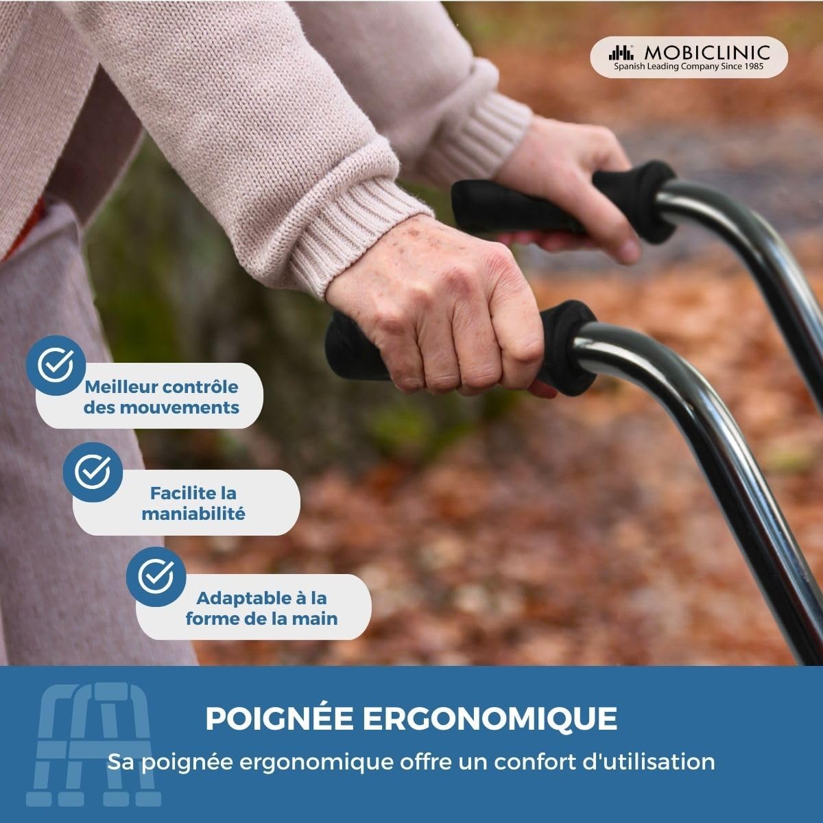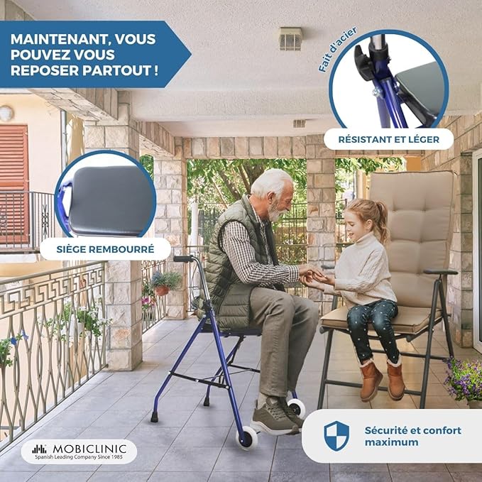 - Mobiclinic®, Déambulateur, Pliable, Emérita, Réglable, Robuste, Avec Siège et 2 Roues, Acier, Poignées Ergonomiques, Léger, Bleu