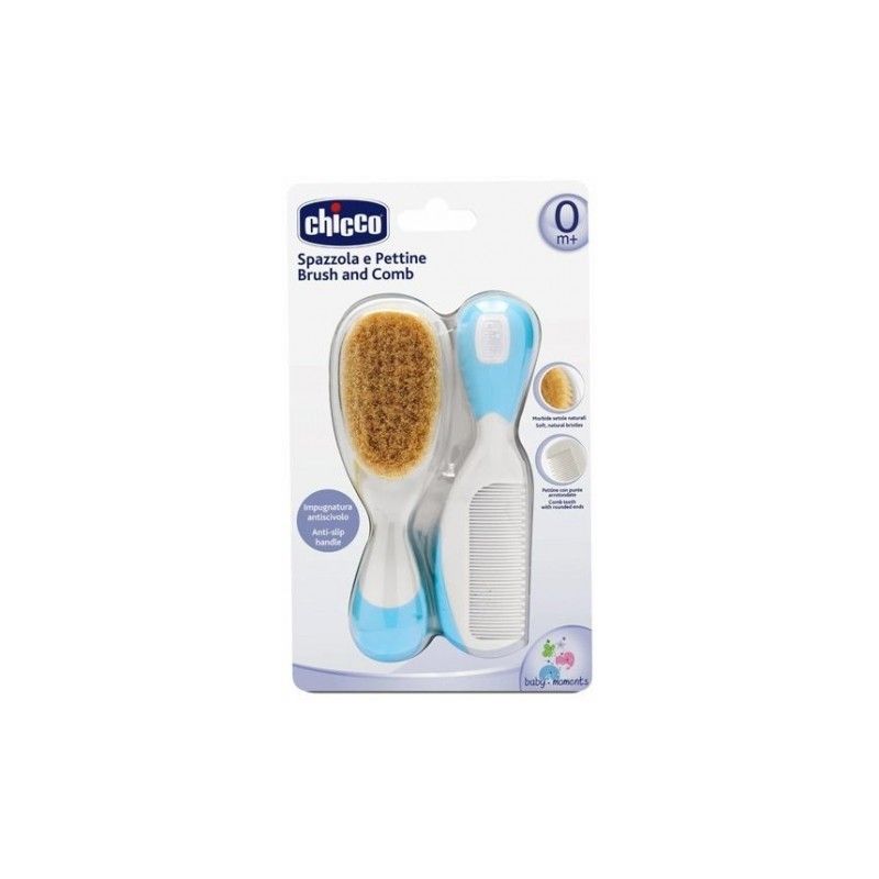 Set Chicco composé d’une brosse et d’un peigne spécialement conçus pour bébé dès la naissance.